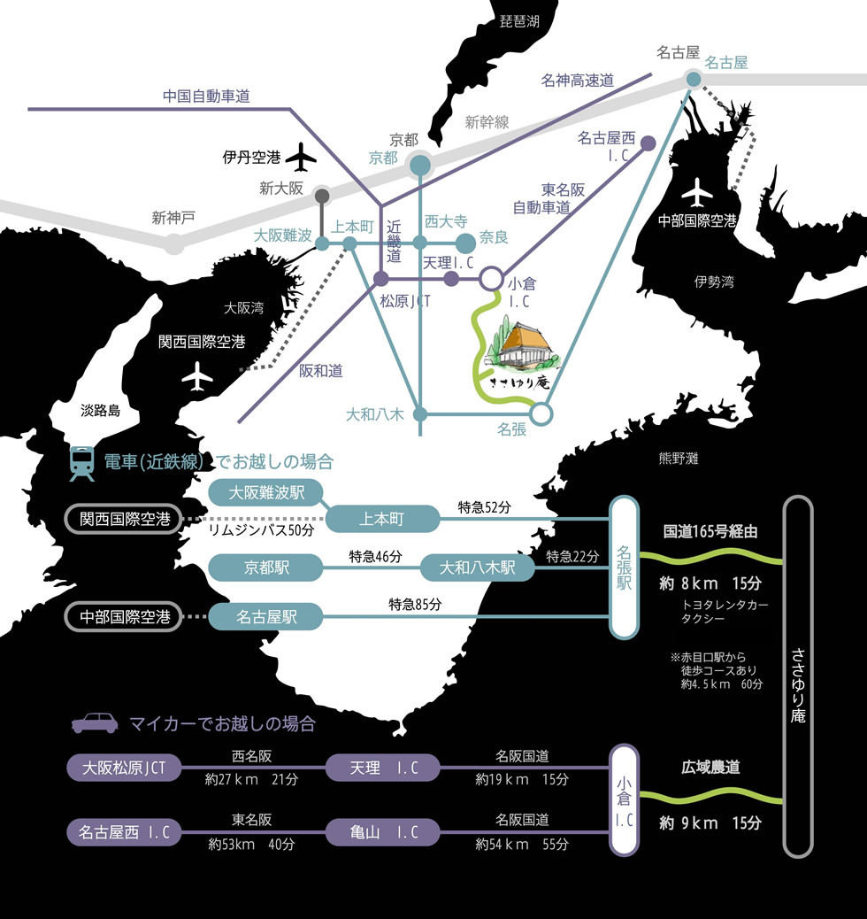 從名阪國道,下小倉交流道。若從橿原/名張方向過來,可走R165,較為方便