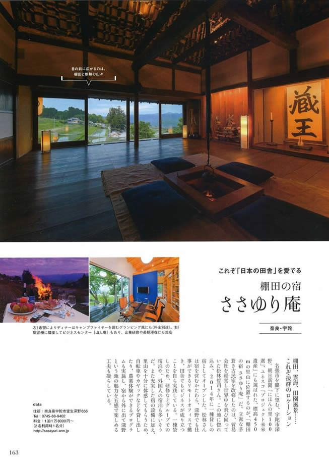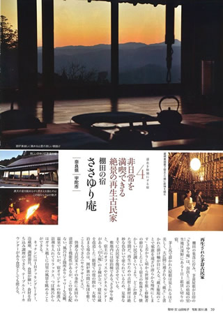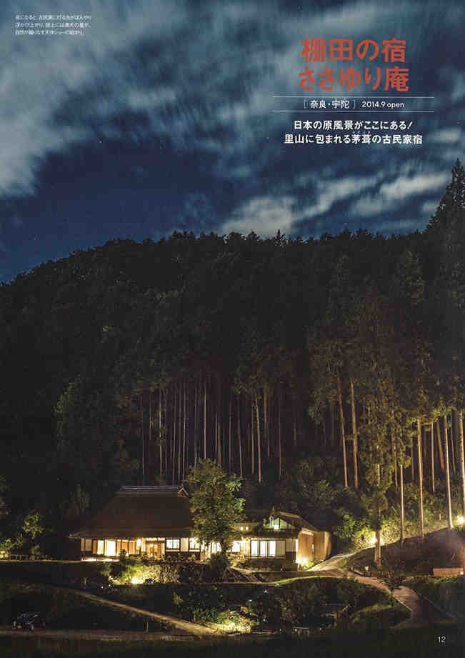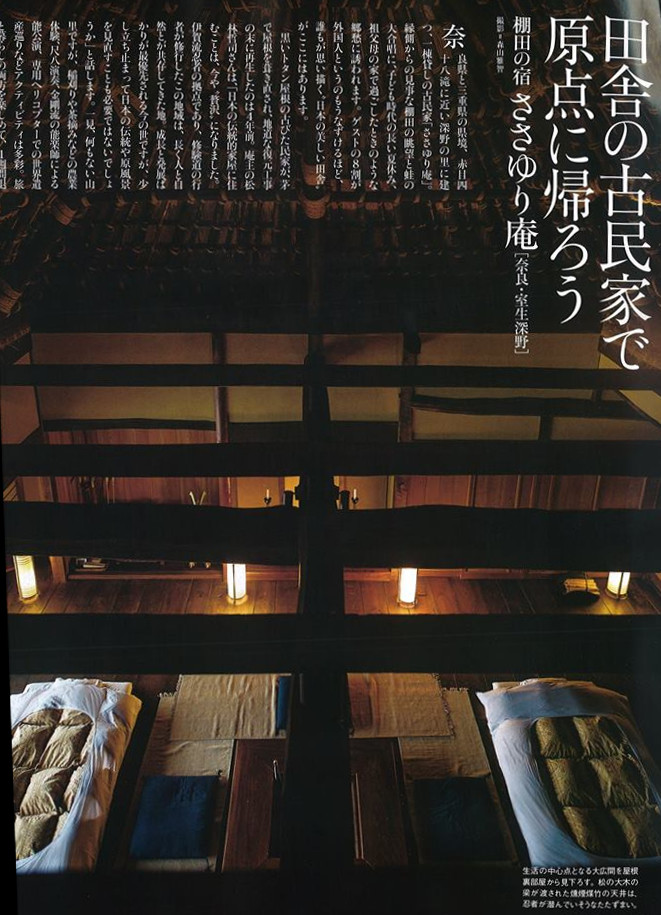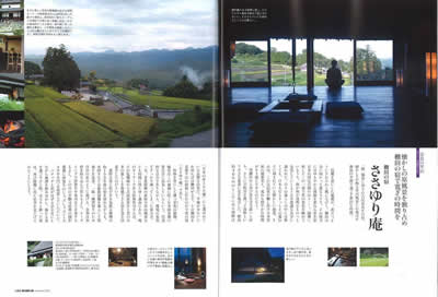 ” 特集「鄉村體驗的旅館90」上了。頭四頁都是本庵的介紹,太感謝了。這本雜誌廣受嚮往自然人們的歡迎,編輯部把本庵選為頭一個,意義很重大,值得自豪。我們會持續不懈地努力。我們衷心期盼著各位光臨本庵與您相會。
