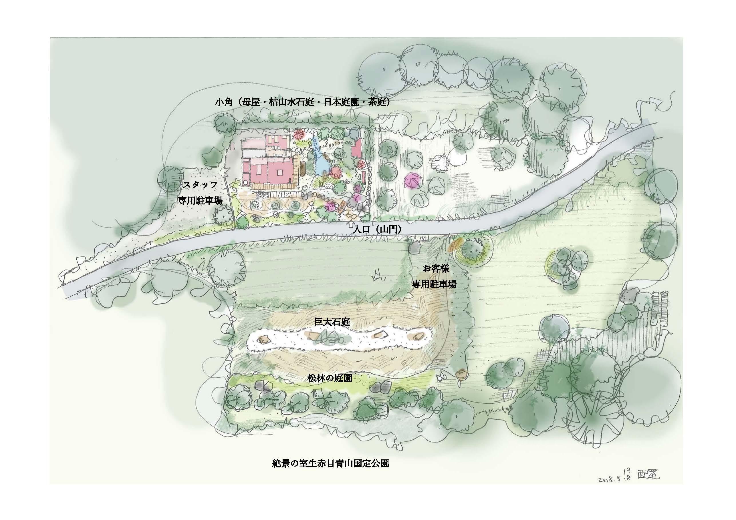 2號店「小角OZUNU」是新近落成的茅葺家屋,配套齊全、設備完善,提供非常舒適的住宿環境。院子裡還有一棟茶亭,周圍布置著「枯山水石庭」、「日本庭園」、「茶屋庭園」三個不同的庭園,讓人誤以為居住於著名神社寺廟中。從地爐房中可以眺望的景致,由近處的「枯山水庭園」、屋前的「松林庭園」,以及運用「借景」手法以國家公園的山峰絕景為遠景而衍生三層互補互襯的巧妙組合,形成美景奇觀。走進當代日式園林,讓您感受時空穿越的氛圍。