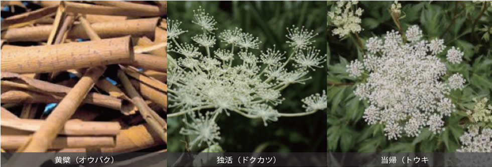 黃檗、獨活、當歸、川芎、芍藥、陳皮、艾草、紅花