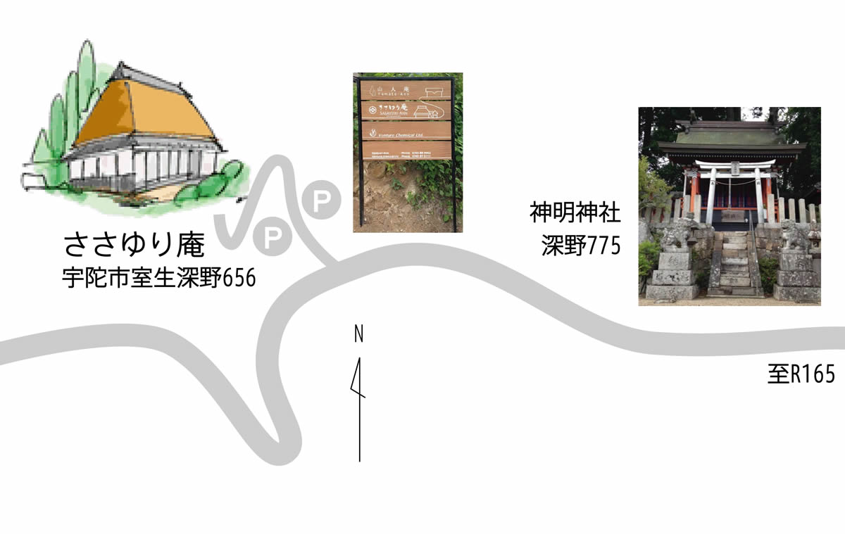 請設定「奈良縣宇陀市室生深野656(番地) 」(地圖編號131 035 168)請依沿路設置的本旅館指示牌行駛,設有停車場(可停放十部車輛)