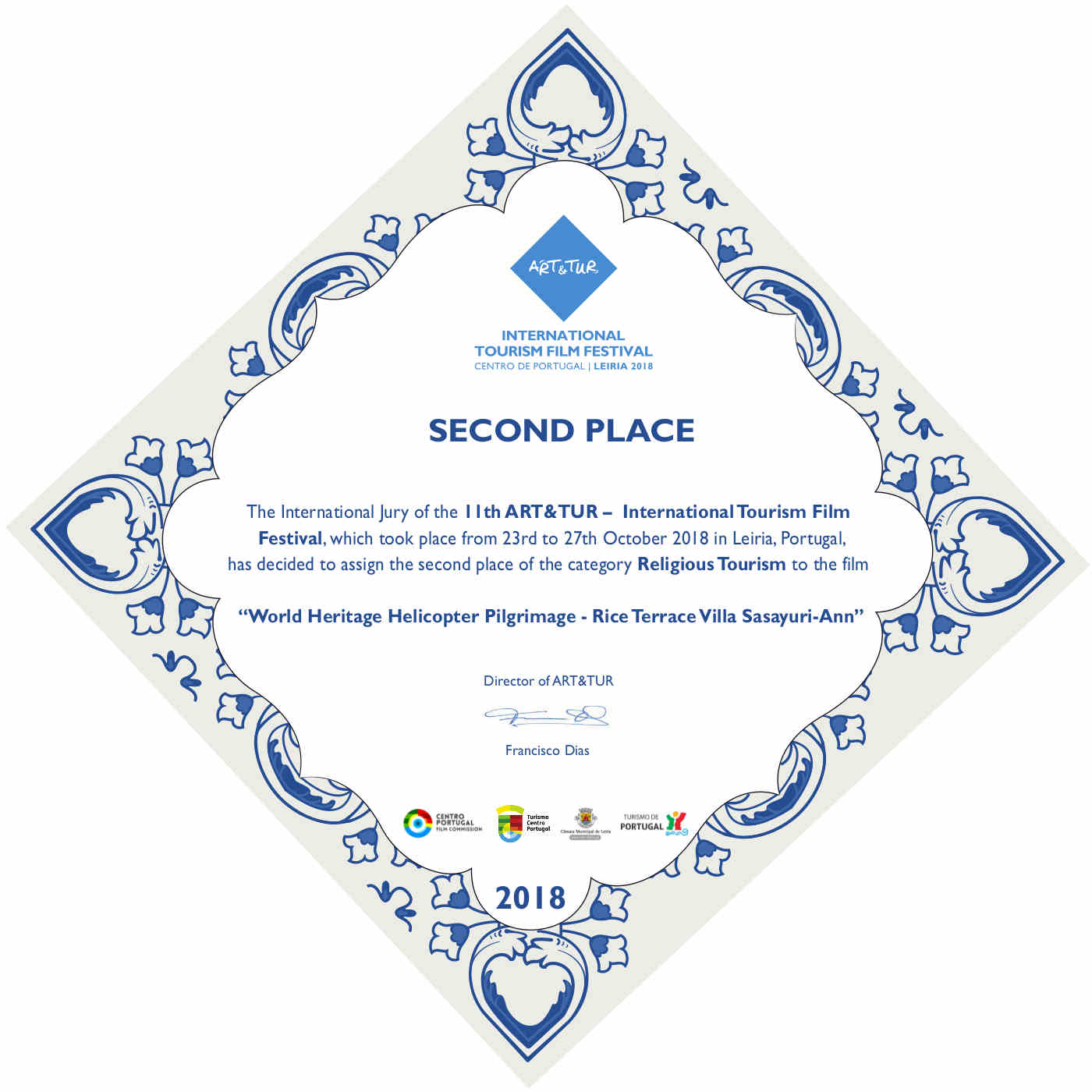ART&TUR2018 榮獲國際觀光影片比賽Second place – Religious Tourism section Award。