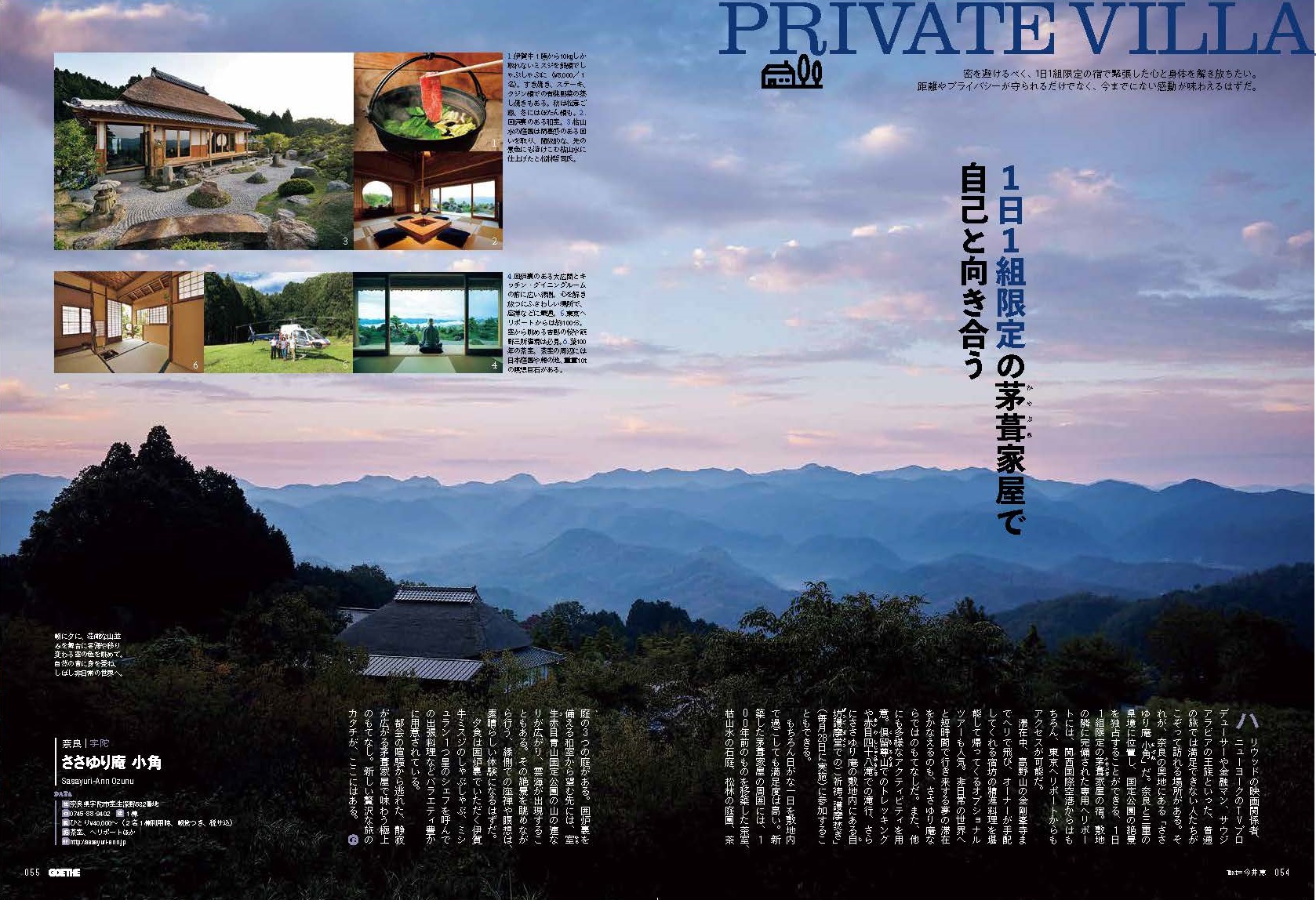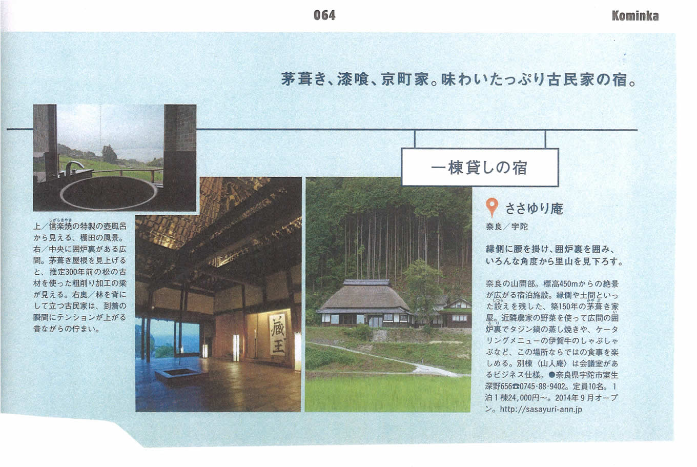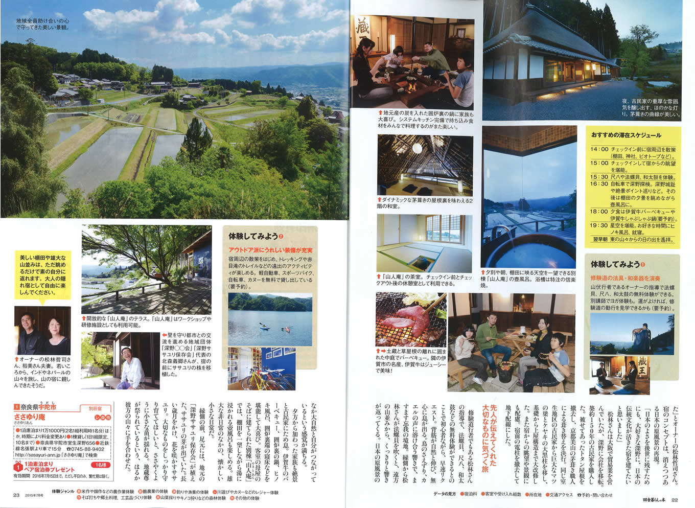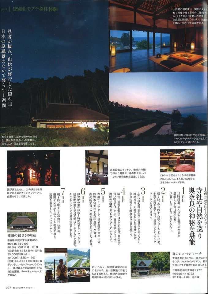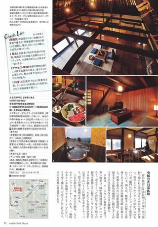 ” 特集「鄉村體驗的旅館90」上了。頭四頁都是本庵的介紹,太感謝了。這本雜誌廣受嚮往自然人們的歡迎,編輯部把本庵選為頭一個,意義很重大,值得自豪。我們會持續不懈地努力。我們衷心期盼著各位光臨本庵與您相會。