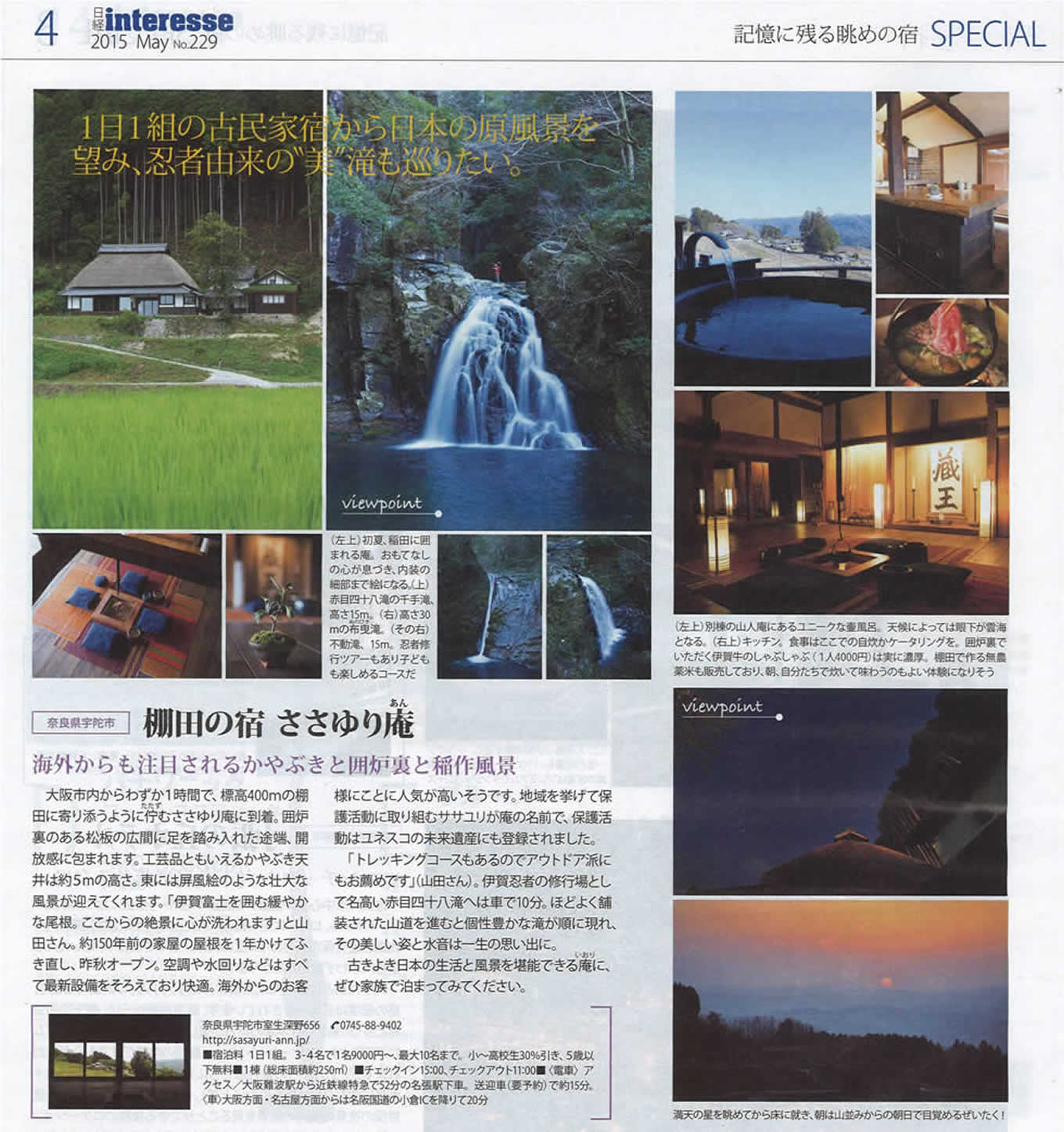 其編輯採訪了我們。他們這次的主題是「可以享受絕景的旅館」。《日經 interesse誌》是針對女性或家族客層,是發行200萬本的全國版報刊,所以我們很是期待。開業不久的我們,非常感謝日經新聞。也感謝把我們介紹給日經新聞的朋友。太感謝了。