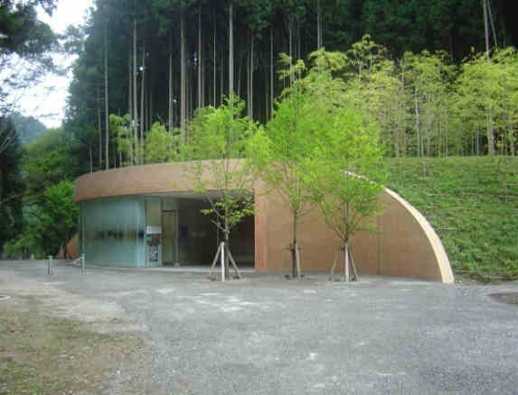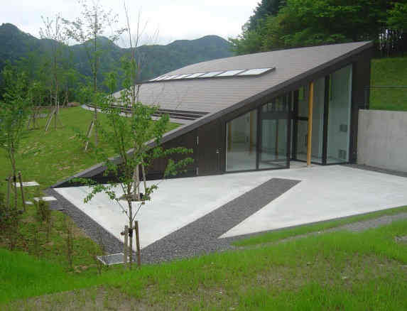 正面入口呈曲線(組合兩個S字形),與此連接的左右翼,則充分利用原來的地形,排除箱狀的建築印象,讓建築與地形一體化。建築物以彩色水泥建造,彩色水泥的顏色是設計師將施工現場的自然土帶到法國去,按照土的顏色而特別調和的。建築物裡中庭長著青苔的小山,跟後面的群山相互對應。訪客中心前面種植的則是日本辛夷。