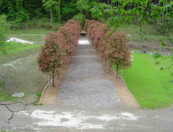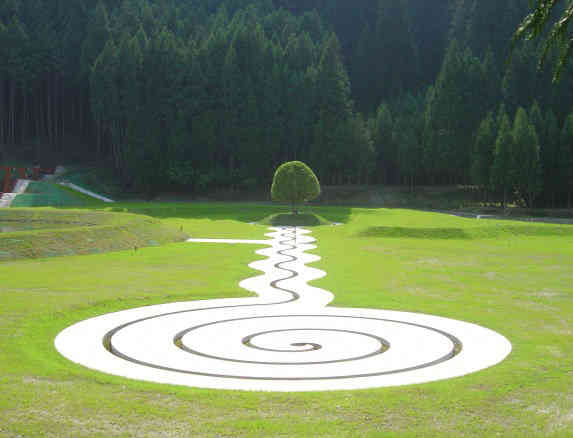 從主園路分支出來的是一條連綿起伏、樹木扶疏的步道,將人們引至以前就有的「弘法之井」。越靠近主園路,步道越寬,越靠近古井就越窄,從古井往回看,可見到呈兩條平行線的路樹。這是在舊室生村出身的已故雕刻家井上武吉先生所應用遠近法的錯視效果,在他的作品中常見此表現方式。因此作家故意應用這方式,向井上氏致敬。是可以體驗不可思議現象的地方。兩旁的路樹是紅要黐(日本紅光葉石楠)。