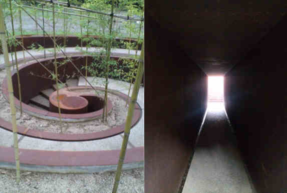 沿著竹林走下直徑17m、深度4m的螺旋狀步道,進入地下空間。如隧道般伸展的通道,緩緩地往上延伸至地面。從開放空間到封閉空間,從地上到地下,從明亮到黑暗,是可以充分感受複雜空間的體驗。