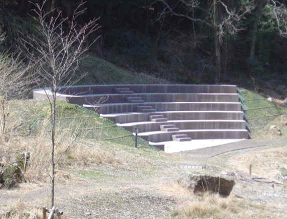可以坐在台階狀的弧形長椅上休息,也可以享受第一湖及其周邊的景致。主體結構以彩色水泥(深褐色築成的「大地」,作者想要與遊客中心一樣,讓觀眾席呈現出現場自然地形中挖掘出來的形式。