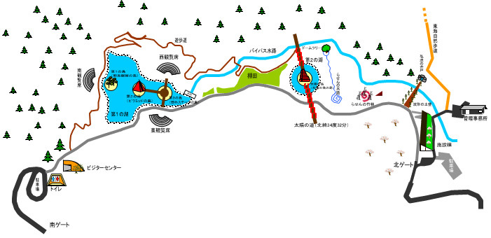 是一條漩渦狀稍淺的水道。是從第一湖引來的流水,孩子們可以安全地把樹葉放在水上,比賽誰比較快的遊戲場所。水道渠中間有作為日晷的鋼製桿。水道的形狀是作者到當地訪問時,看到蛇逃走時的模樣的具象化・・・・・・。位於水道起點的那棵樹則是丹桂。