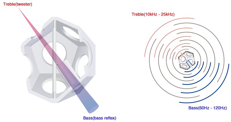 同軸・全向性是指在所有構成十二面體的六個對面中的其中一對分別安裝有高音揚聲器以及可以擴張低音的低音反射端口。此外在以此兩面構成的軸線周圍配備中音揚聲器,達到保持全向性同時又能實現同軸形揚聲器構造的效果。 為了進一步發展音質,在以揚聲器為中心的垂直軸上,每隔120°夾角分別安裝有高音揚聲器,使得在水平方向上也能夠均等的發出高頻聲響。這是一個結合了以往全向性和同軸揚聲器所分別擁有優點的揚聲器,相信能為聲學和音樂開闢全新的前景。