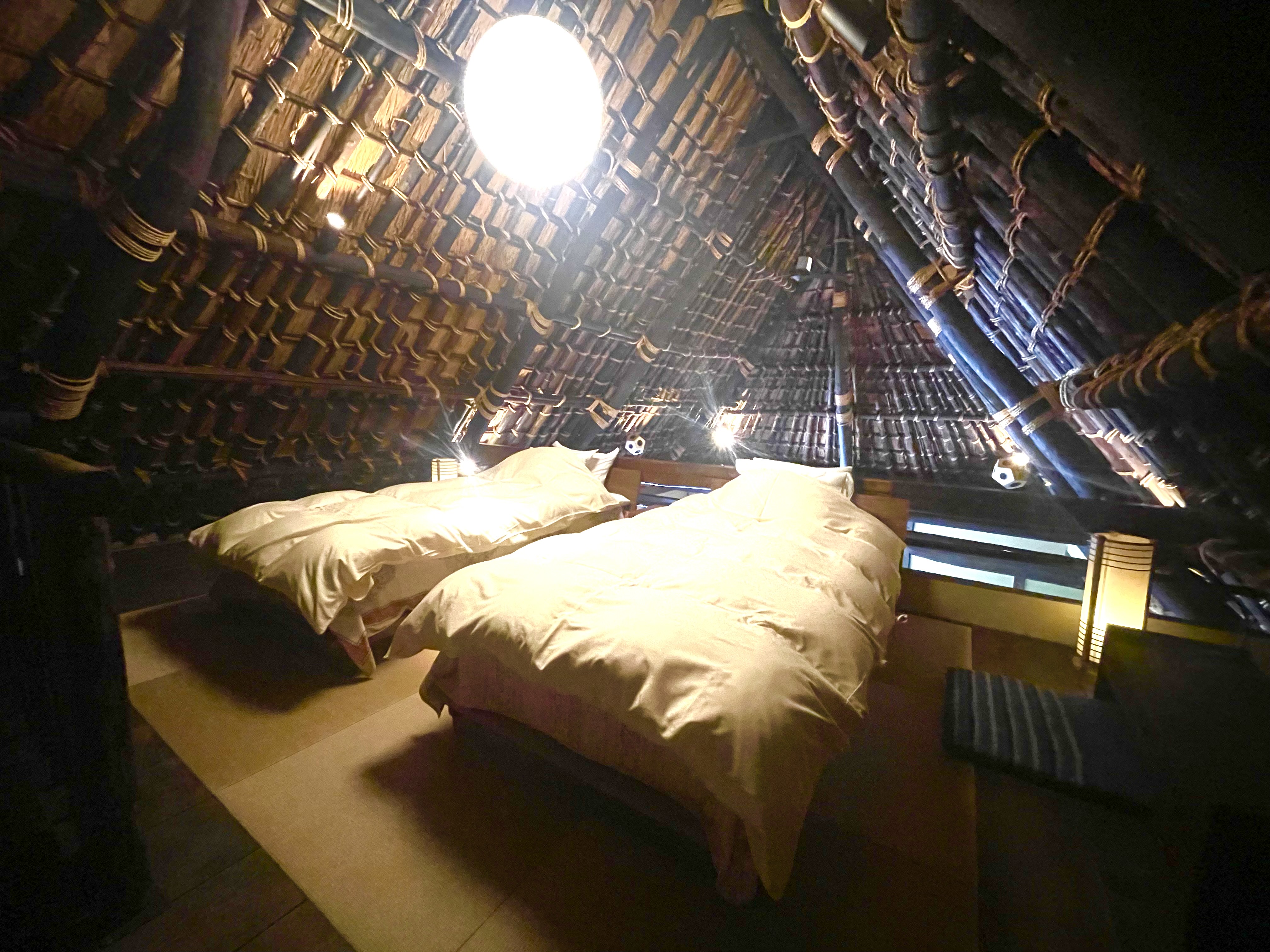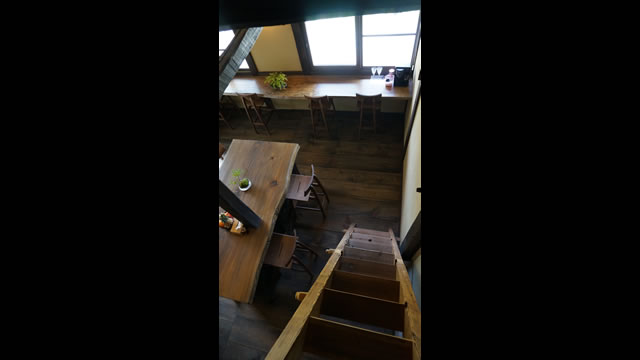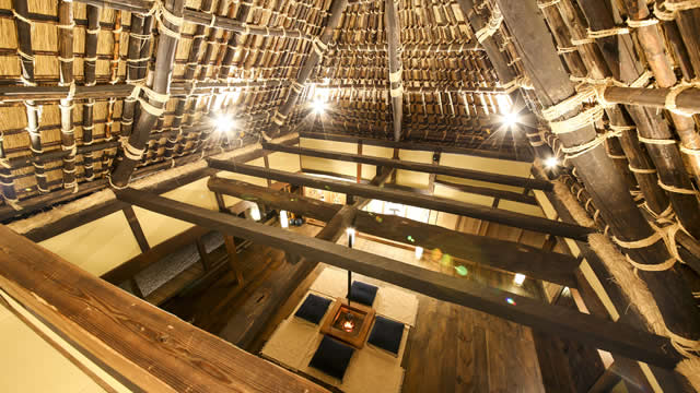 從約8張榻榻米大小的閣樓,往下看就是圍坐地爐邊的情景;往上可以伸手觸摸屋頂結構。感受像隱身密室的氣氛
