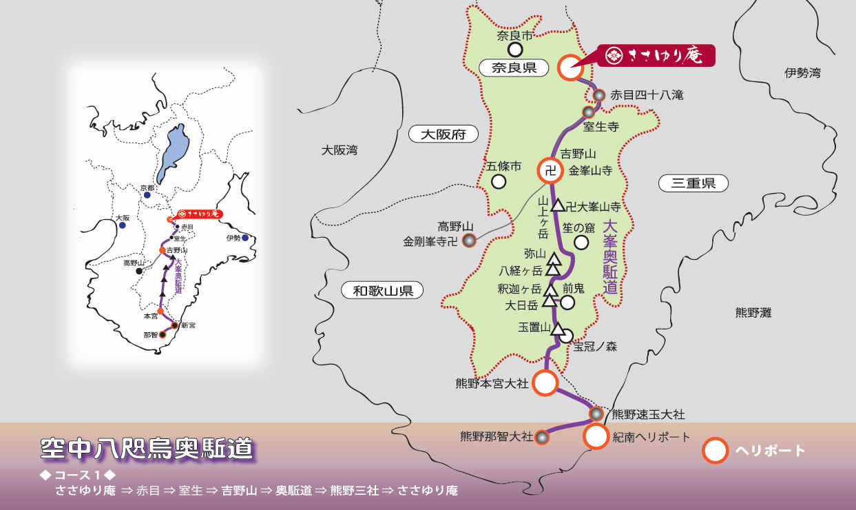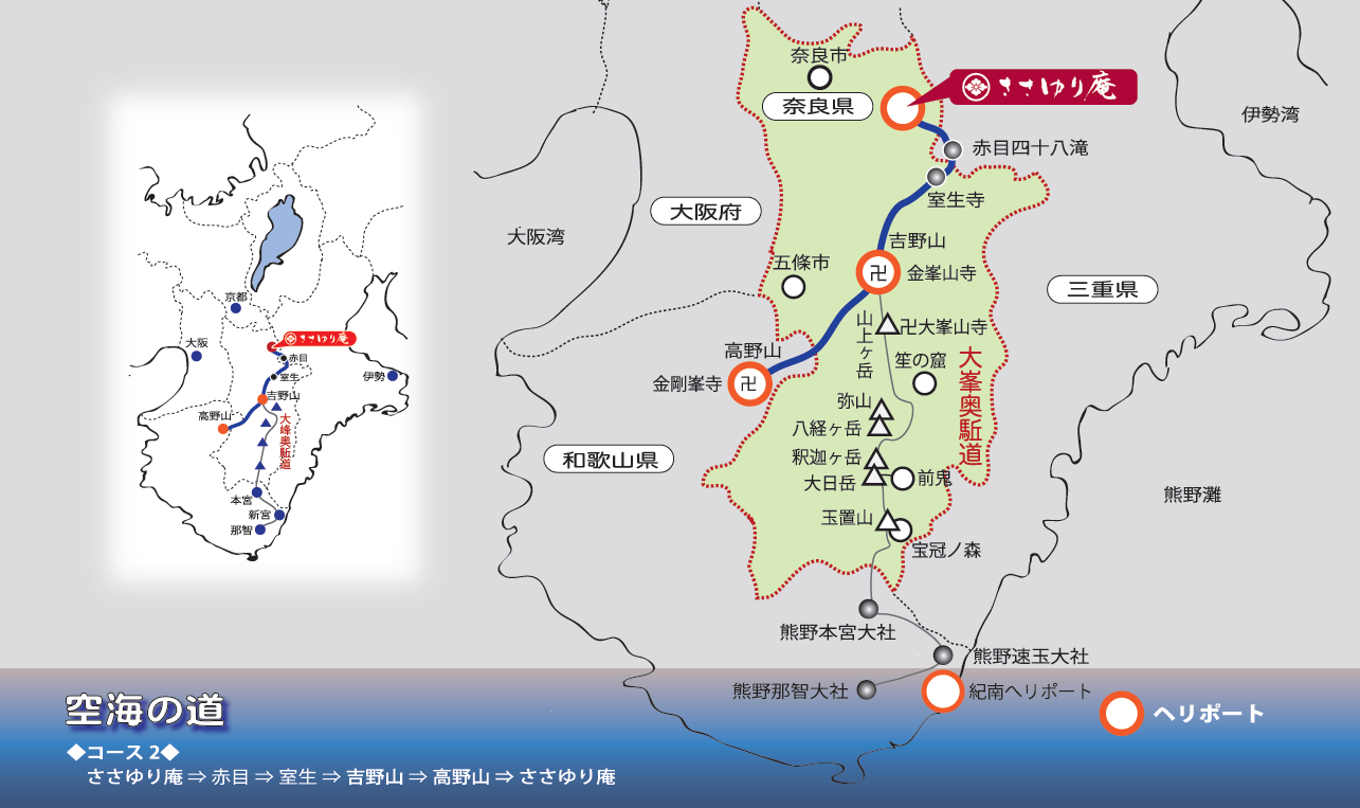 笹百合SASAYURI庵位於紀伊半島,奈良縣和三重縣的交界,以本庵為中心,北至「京都」,東至「伊勢」,西至「奈良、大阪」,南邊還有兩大聖地「吉野山、高野山」,可說是位於關西地區觀光景點樞紐般的中心位置。使用陸路的旅程自是不消說,天空中的飛行旅途,更會留下難忘的回憶。「紀伊山地的靈場與參拜之道」即橫跨奈良縣、和歌山縣、三重縣的三個靈場(由吉野、大峯、高野山組成的熊野三山)及參拜之道(大峯奧駈道、高野山町石道、熊野參詣道),在2004年7月7日列入了世界遺產。